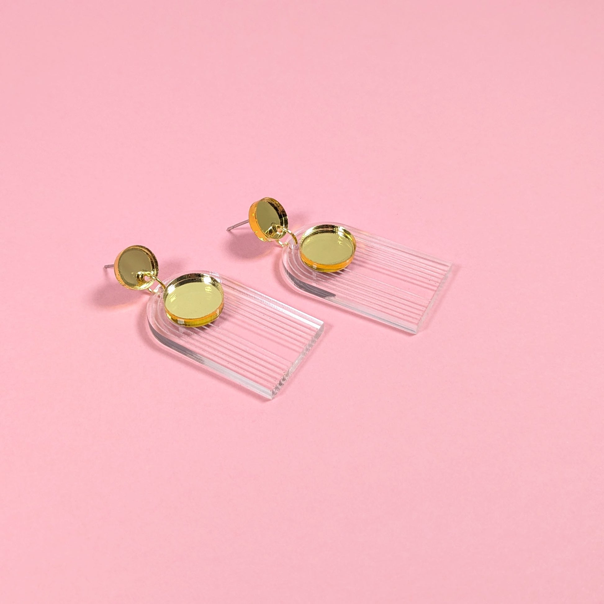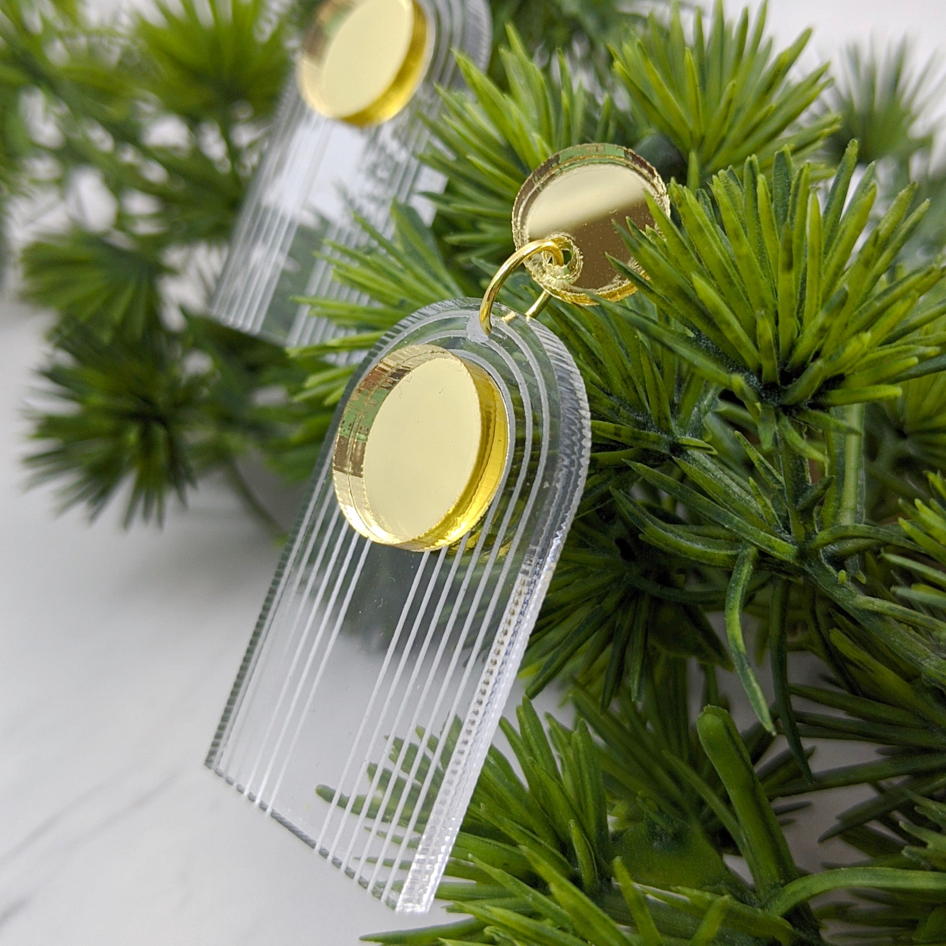 Laser etched earrings with a fun juxtaposition of reflective and transparent materials. These Art Deco inspired earrings are very light weight and a perfect match for any look.