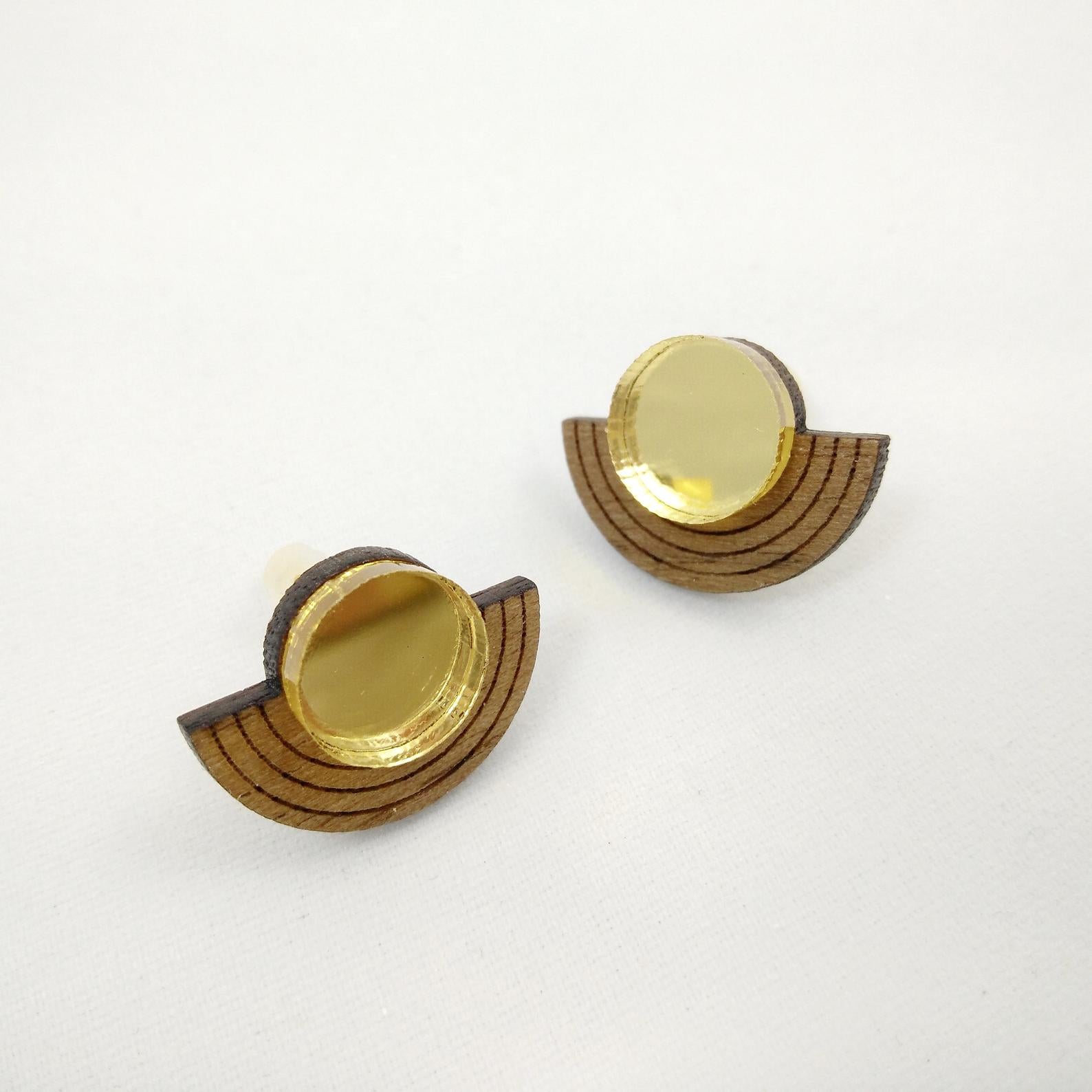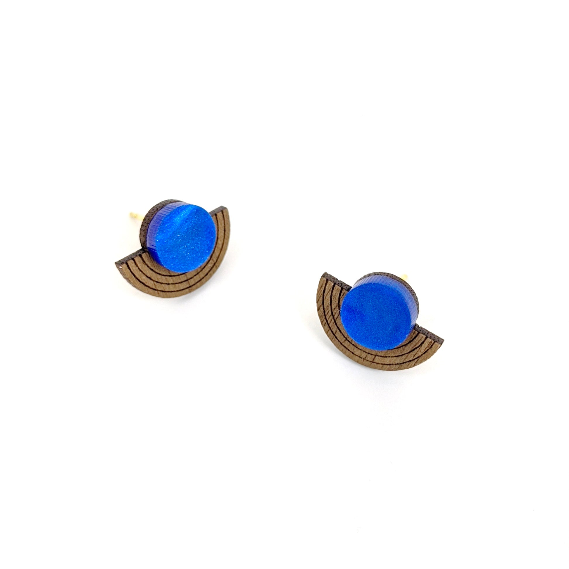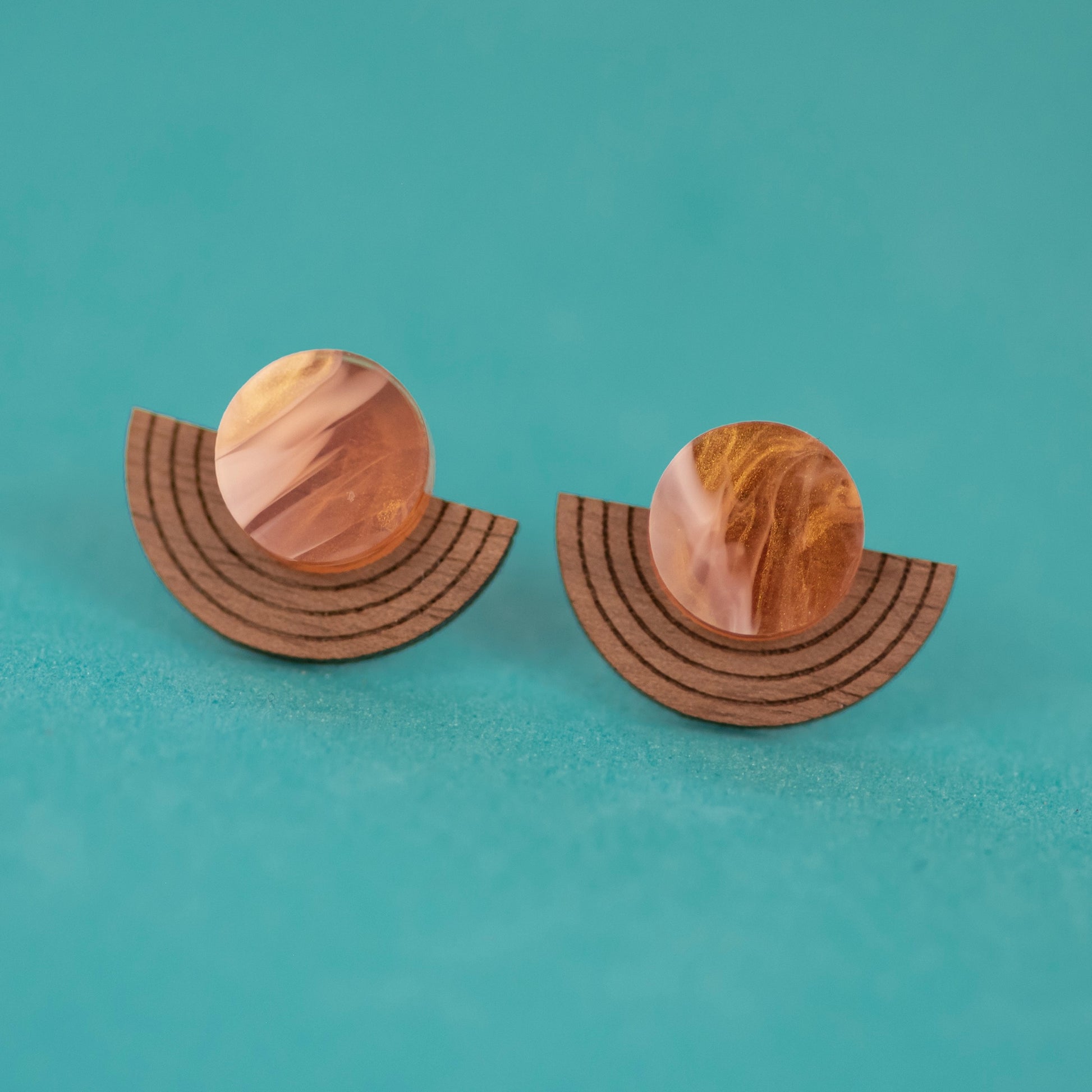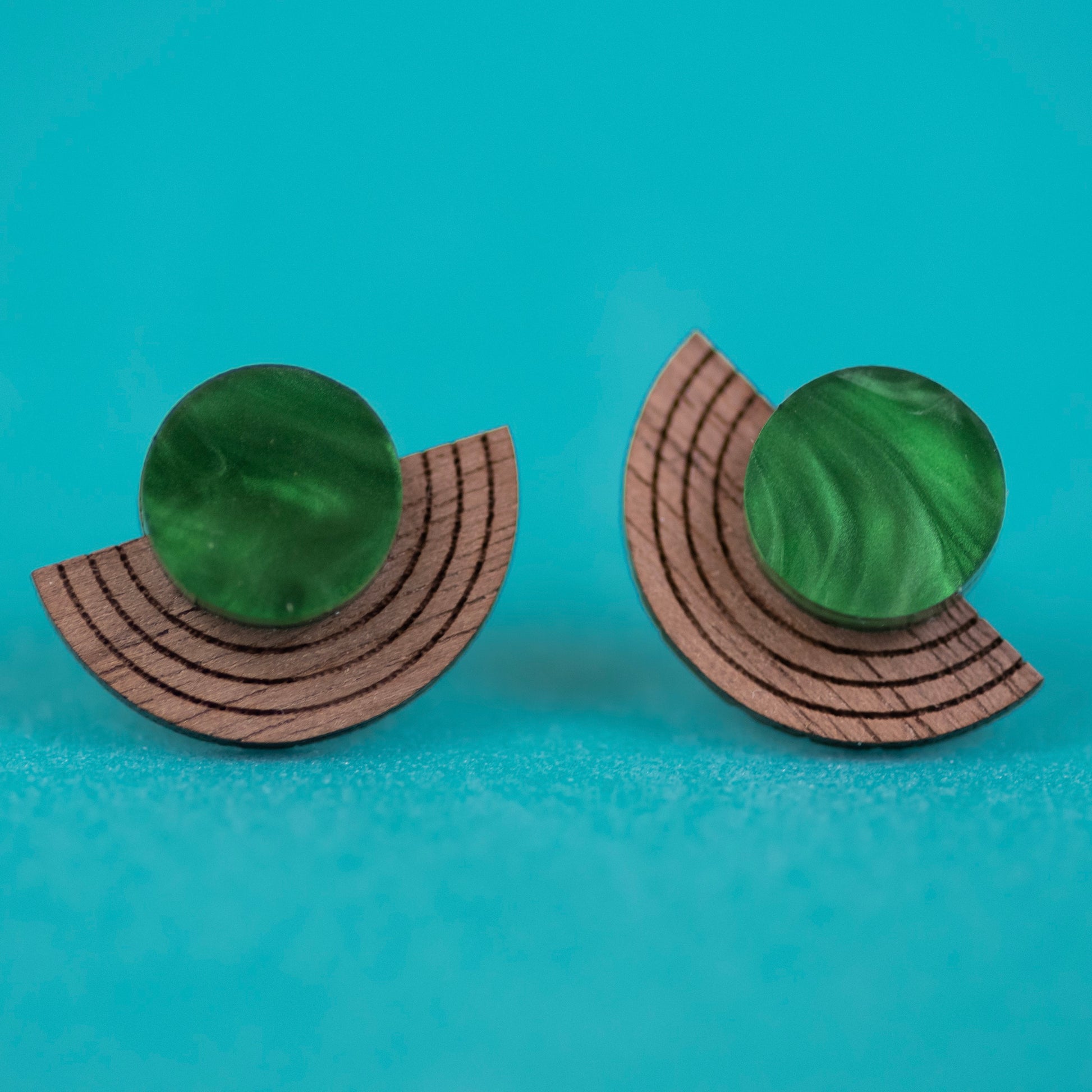 A luxurious pairing of laser engraved walnut wood and colorful acrylic, inspired by the 1920s Art Deco style. These are the perfect size for all day wear and work well with a casual outfit or something a little bit fancier.