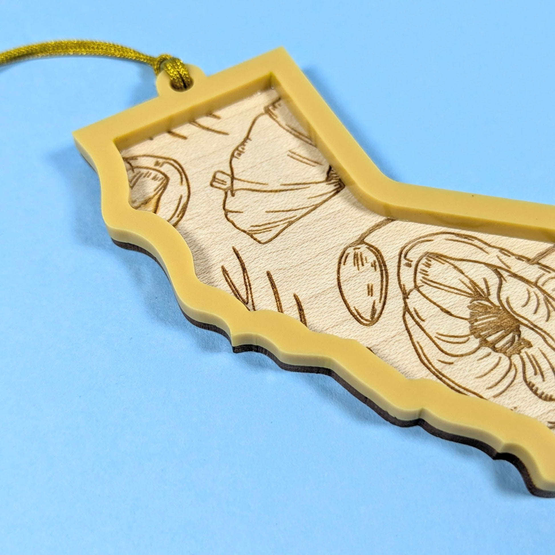 Layered maple wood and acrylic, with laser engraved poppy details. Gold colored loop for hanging.
