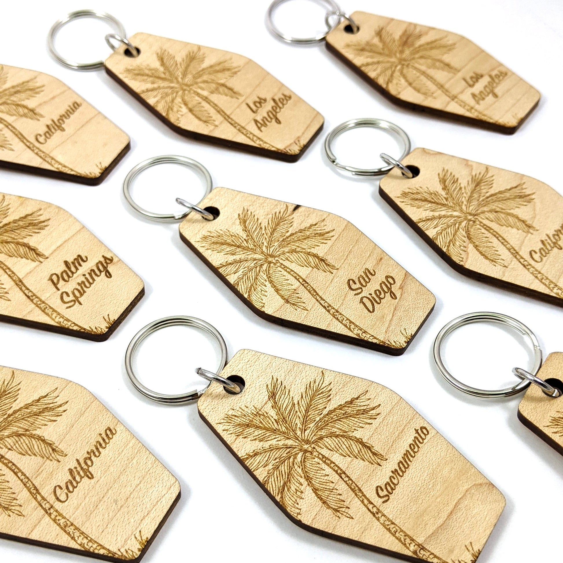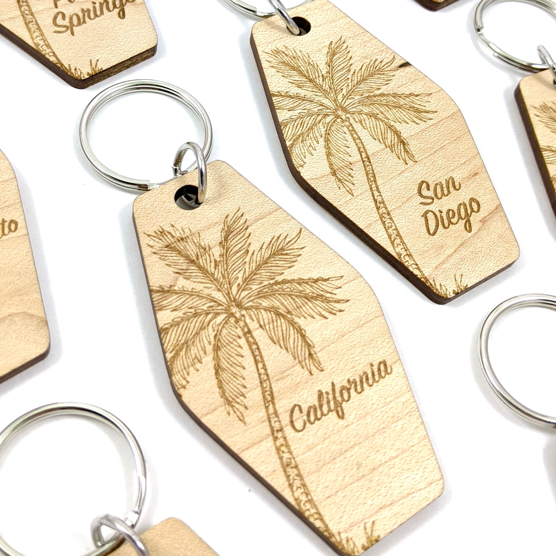 Maple wood keychain featuring an engraved palm tree design and your choice* of city, neighborhood, or state. Keychains will be made to order.