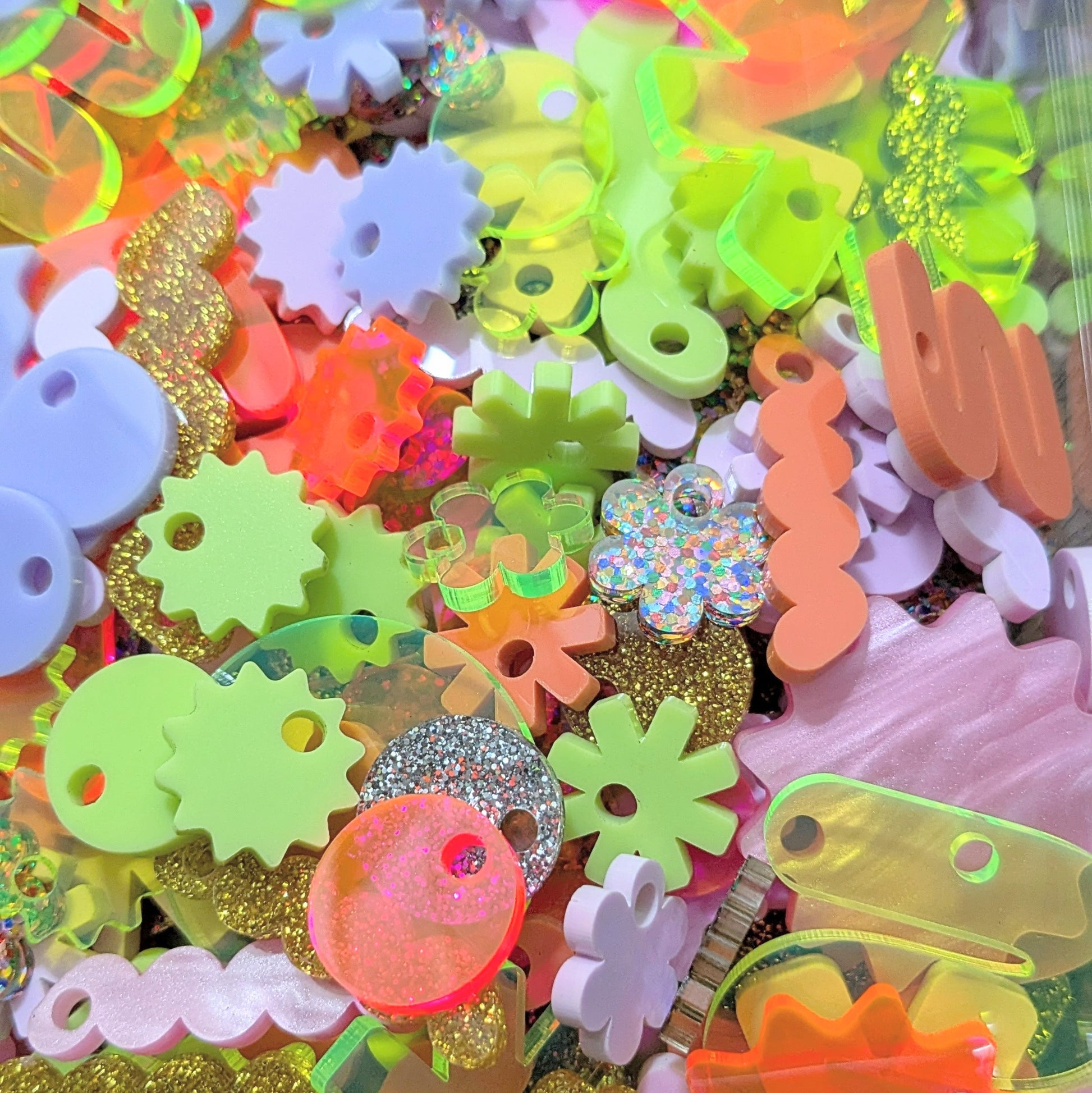 Mix and match your own bag charm keychains from an assortment of fun and colorful shapes. The easy to open hardware allows you to quickly add or subtract parts. Endlessly rotate pieces to match your style!