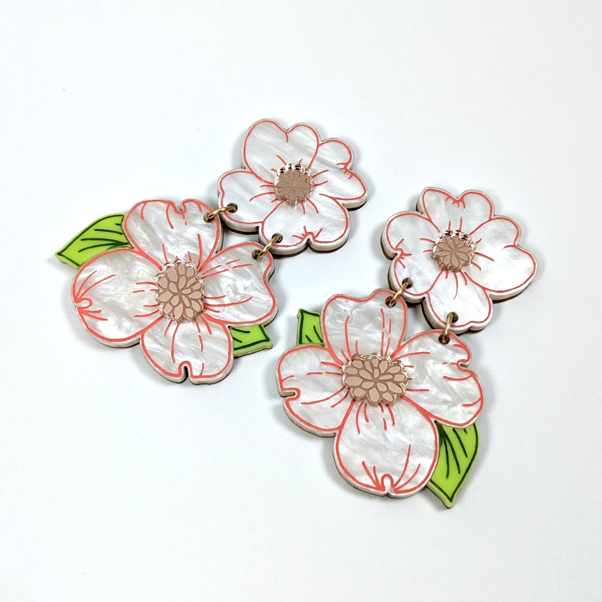 These bright and bold floral statement earrings are playfully inspired by the dogwood flower. Layers of shimmering pearlescent white acrylic with hand painted pink details, eye catching mirrored rose gold, and chartreuse leaf accents, all backed with a thin layer of solid maple wood. Fastened together with champagne gold jump rings.