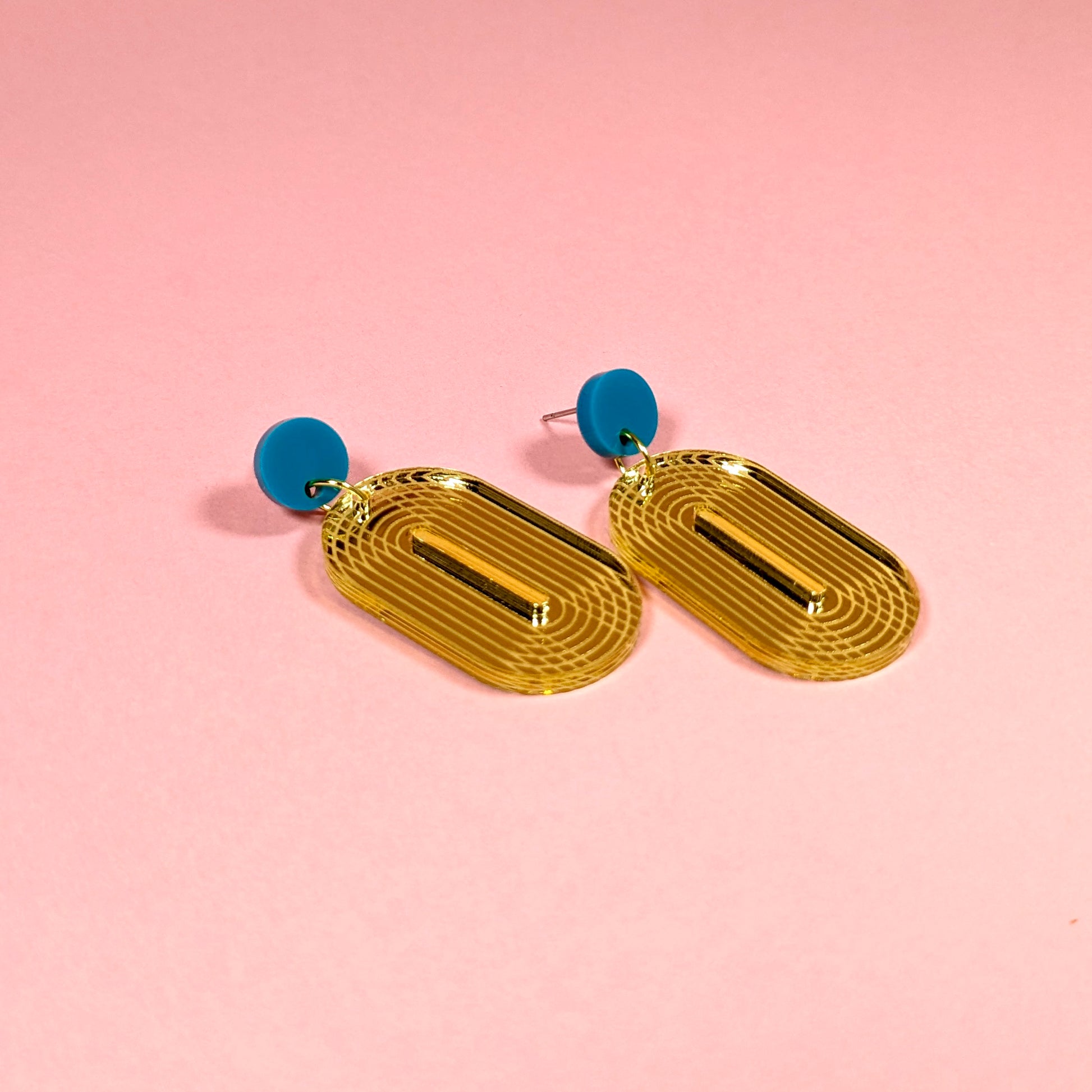 Laser engraved gold mirrored acrylic with teal stud. An elegant statement piece.