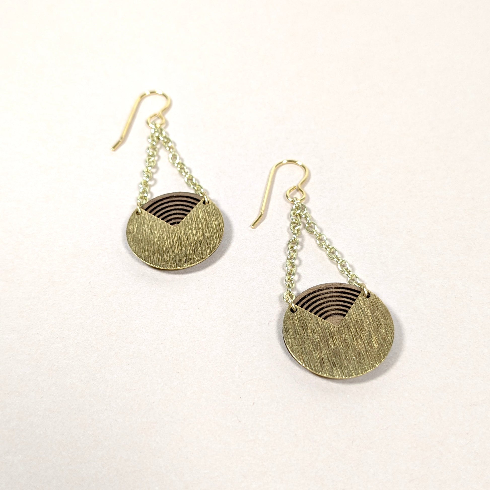 Brushed brass paired with thin, laser engraved walnut wood. Gold toned chains and hardware complete the look of these lightweight earrings. The brushed finish on the brass catches the light nicely.