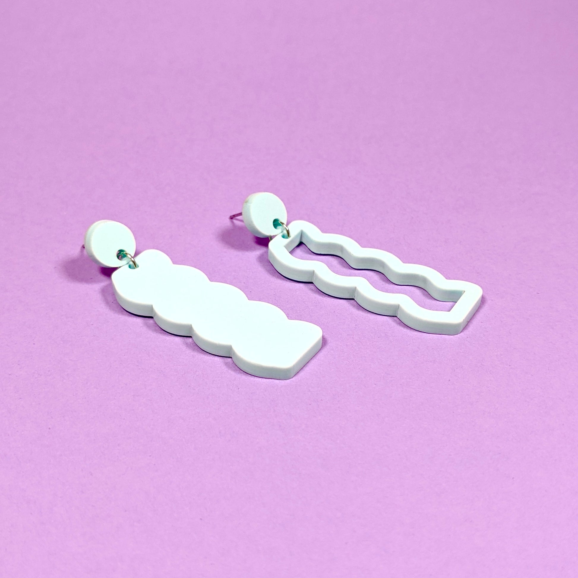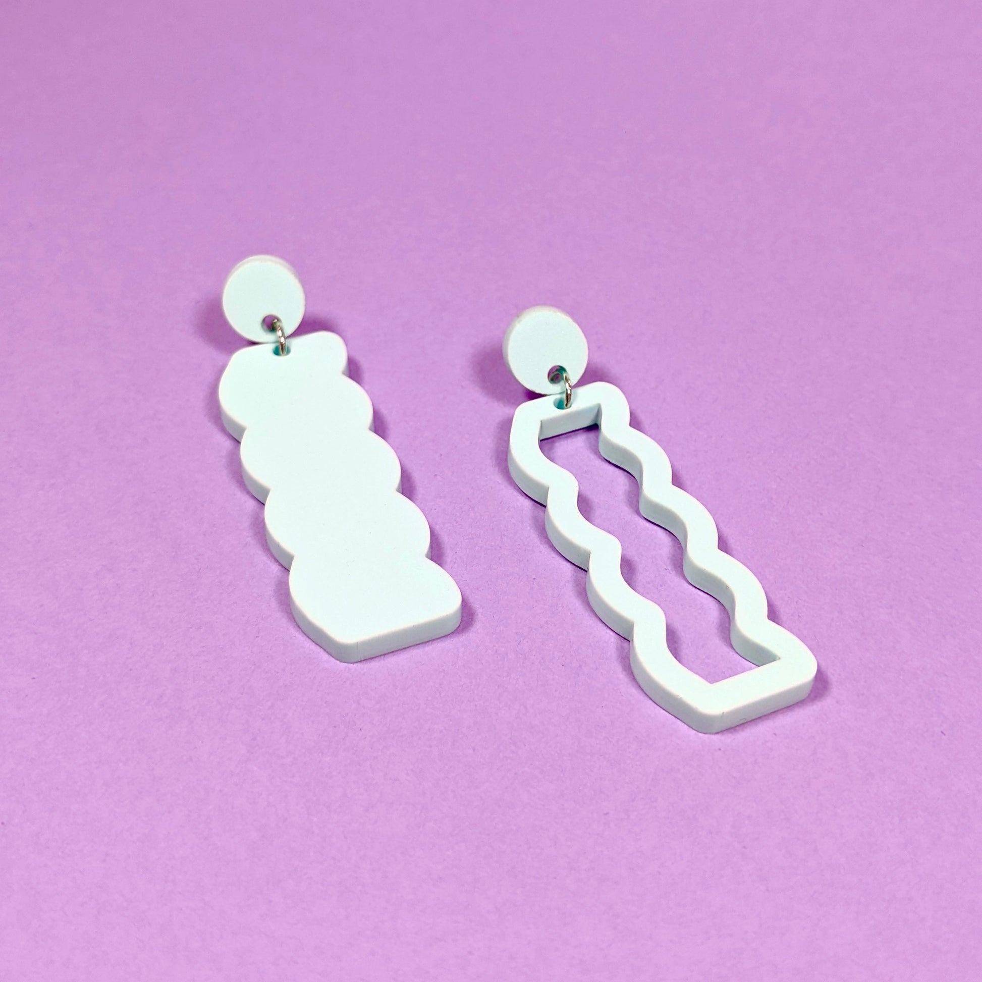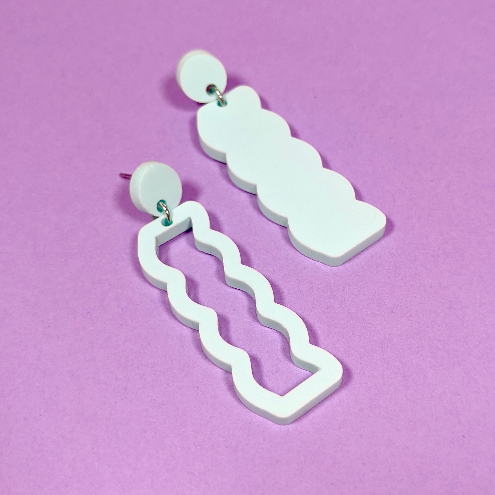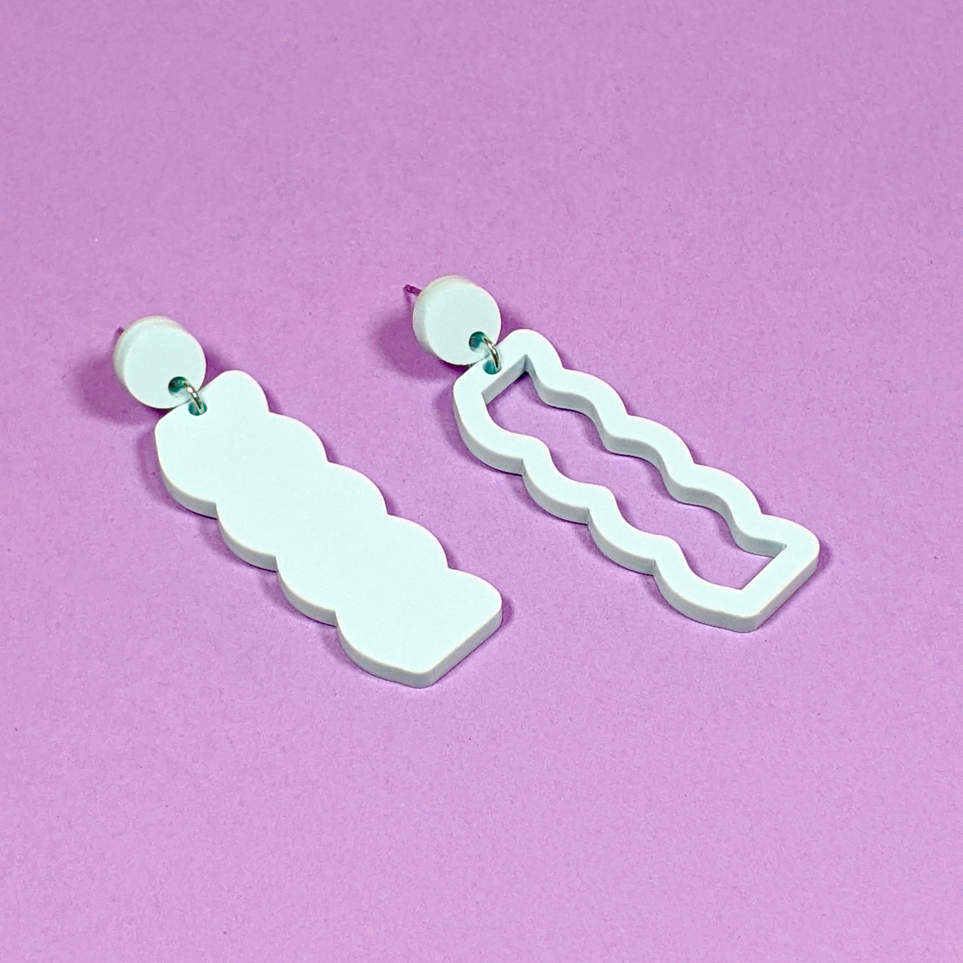 These simple, modern earrings make a statement with their mismatched look. Laser cut from light blue colored acrylic, with a matte finish.