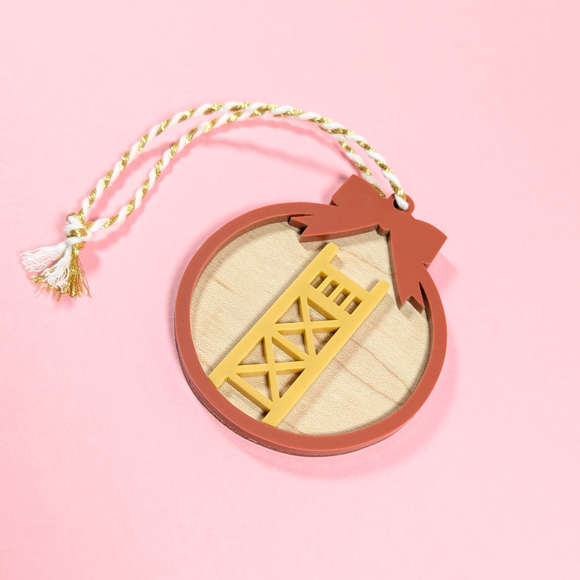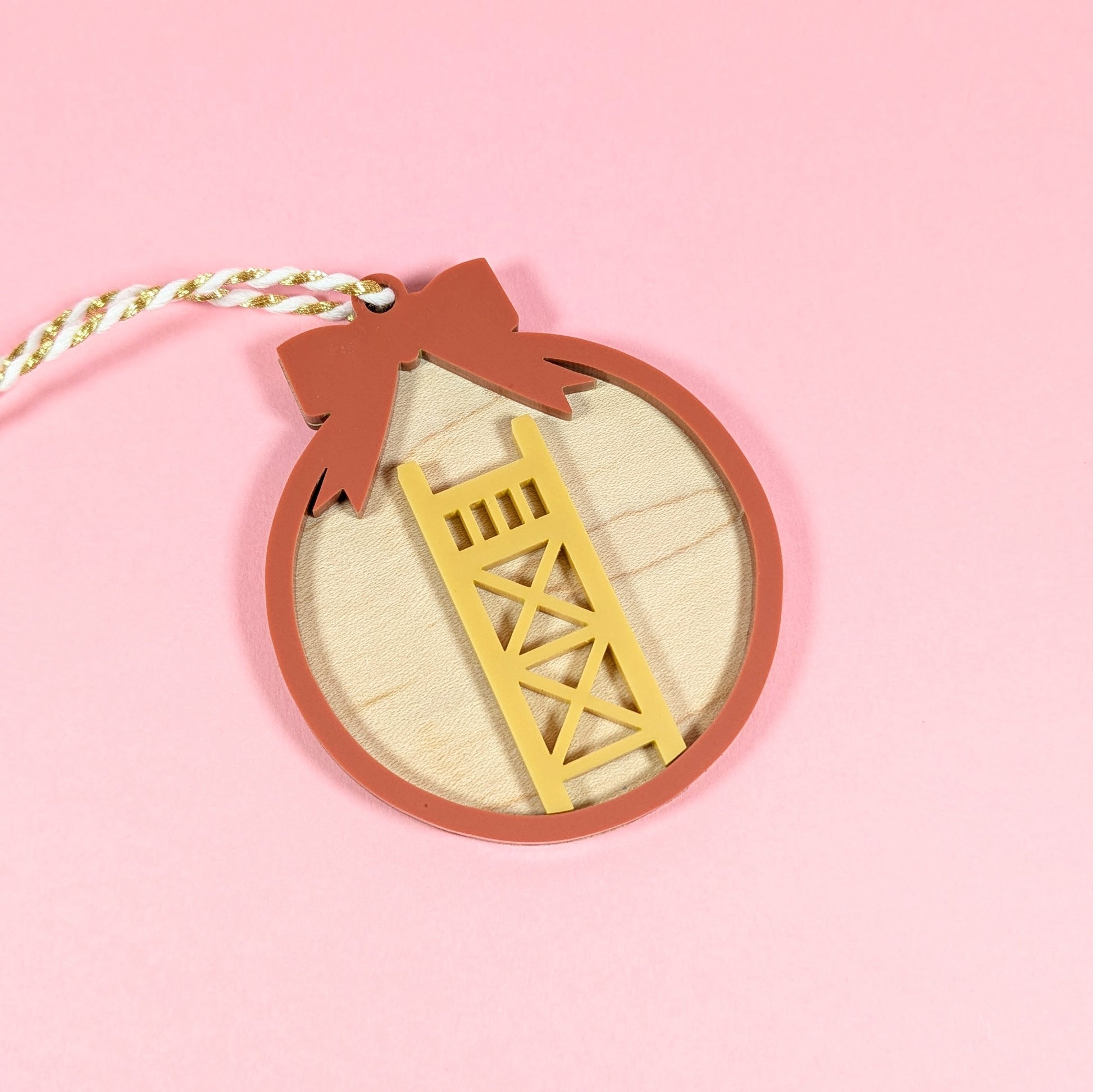 Layered maple wood and acrylic details, with laser engraved "Tower Bridge Sacramento, CA" on the back. Thick white and gold twist twine loop for hanging.