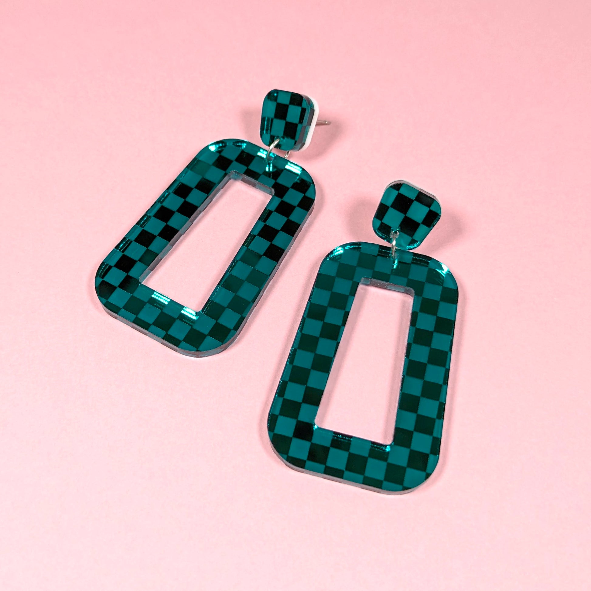 Vibrant mirrored teal acrylic, engraved from the back side of the material to create a partially transparent checkerboard pattern.
