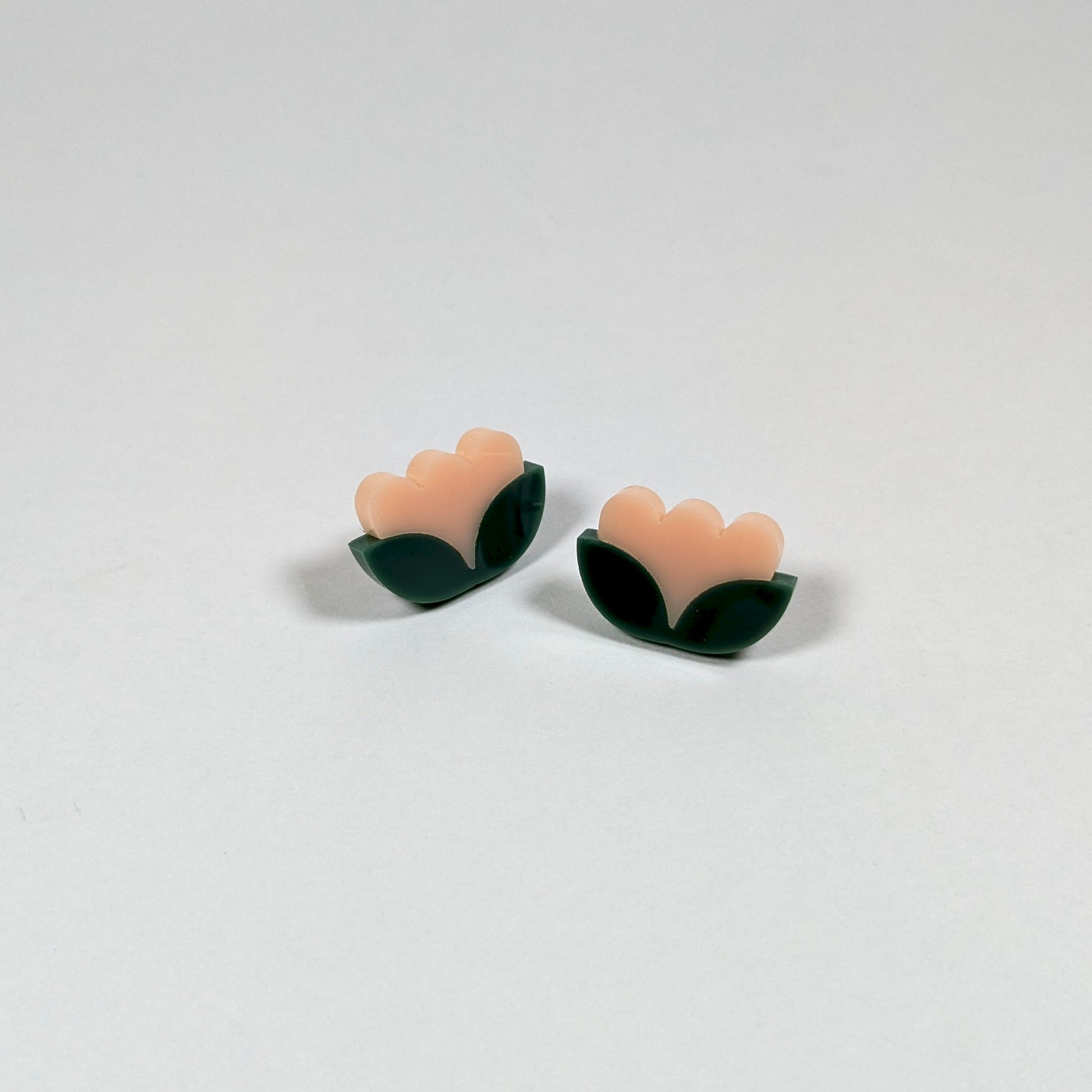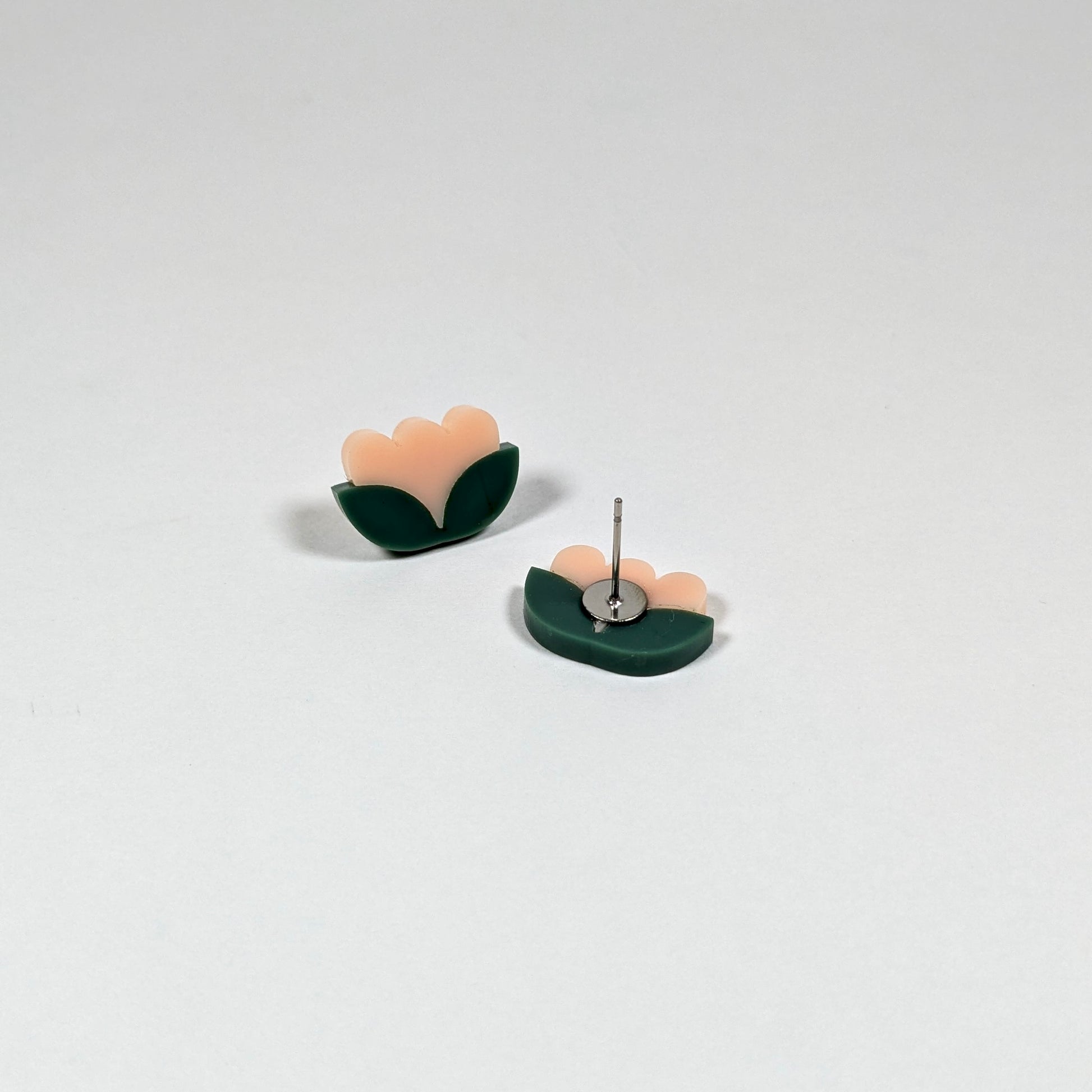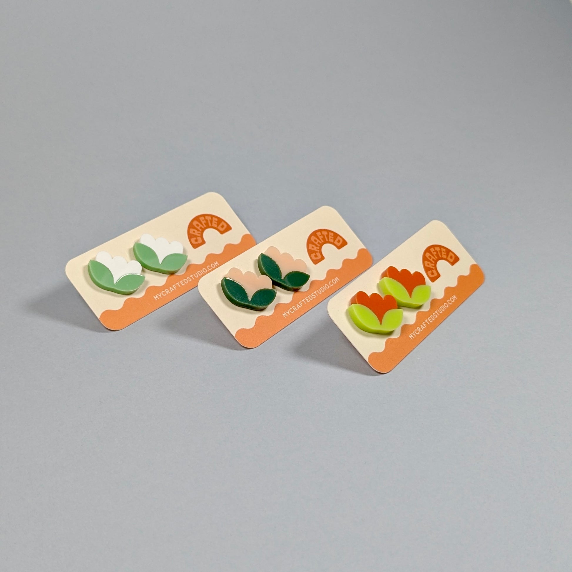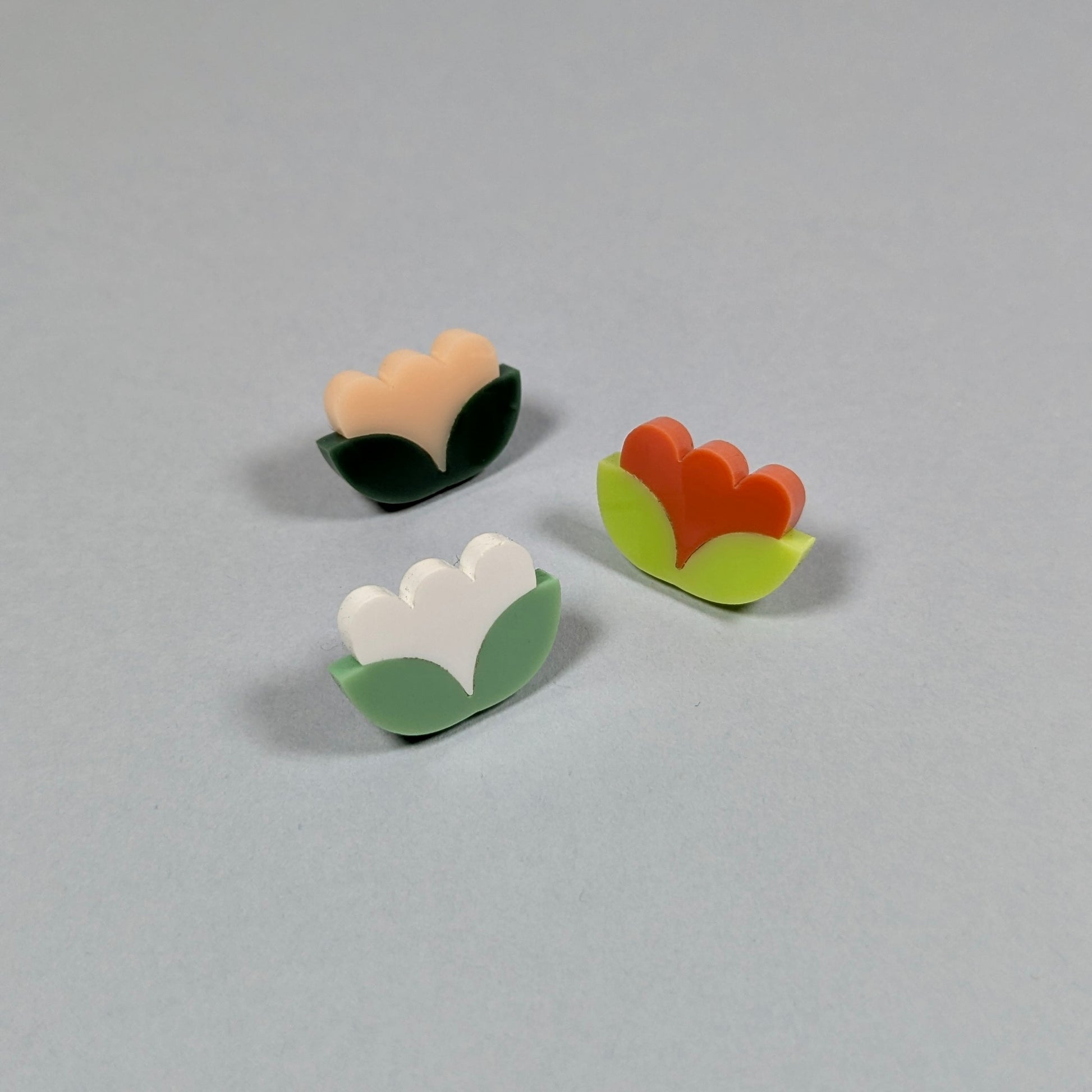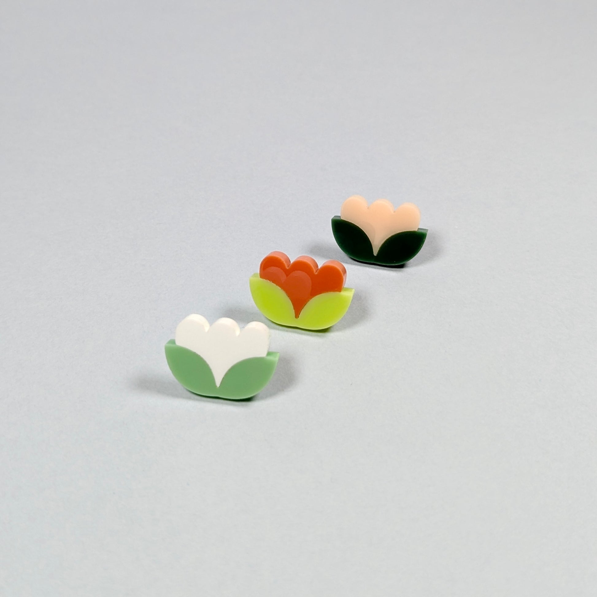 Mid-sized stud earrings, featuring a stylized tulip floral motif, in 3 contrasting color option. Made from acrylic